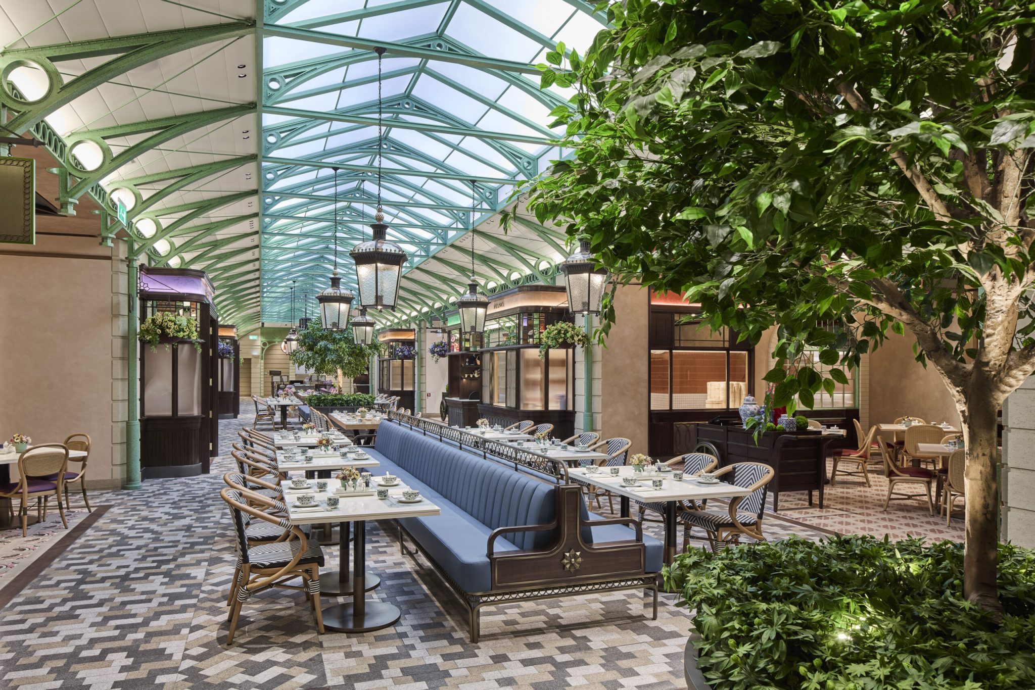 In designing the space, we drew heavily from Covent Garden’s rich architectural textures—such as patterned flooring, cobblestone pathways, geometric patterns, hanging baskets, and stone walls—paying tribute to the neighbourhood’s character. We also collaborated closely with our lighting consultant to recreate the sense of open sky typical of a walk through Covent Garden, bringing a layer of detail.